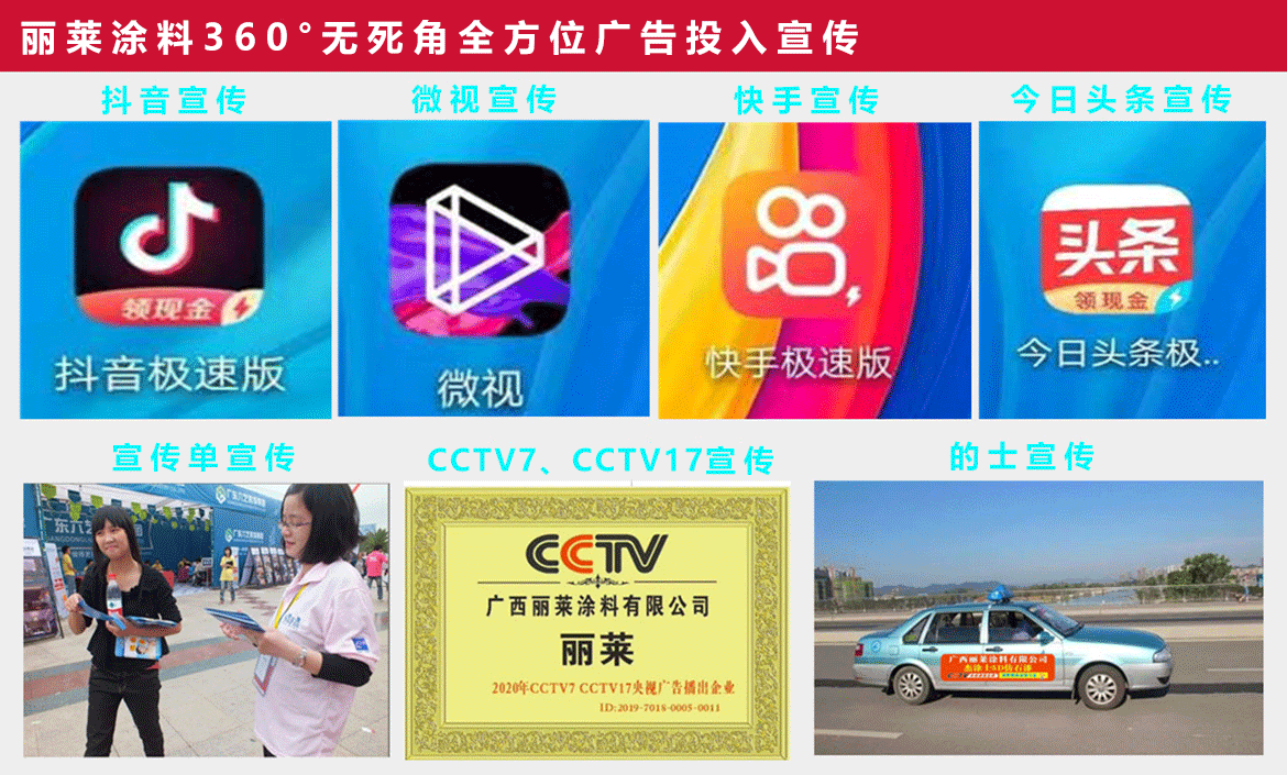 麗萊涂料持續(xù)投入數(shù)千萬(wàn)元,在央視、地方衛(wèi)視、報(bào)紙、雜志、戶外路牌等各大傳統(tǒng)媒體進(jìn)行不間斷的形象廣告宣傳,在全球知名的阿里巴巴、新浪、網(wǎng)易、搜狐、慧聰、鳳凰網(wǎng)、中國(guó)建材網(wǎng)等新媒體進(jìn)行全方位立體式傳播,關(guān)注健康生活,關(guān)注環(huán)保建設(shè),迅速提升品牌知名度和美譽(yù)度。